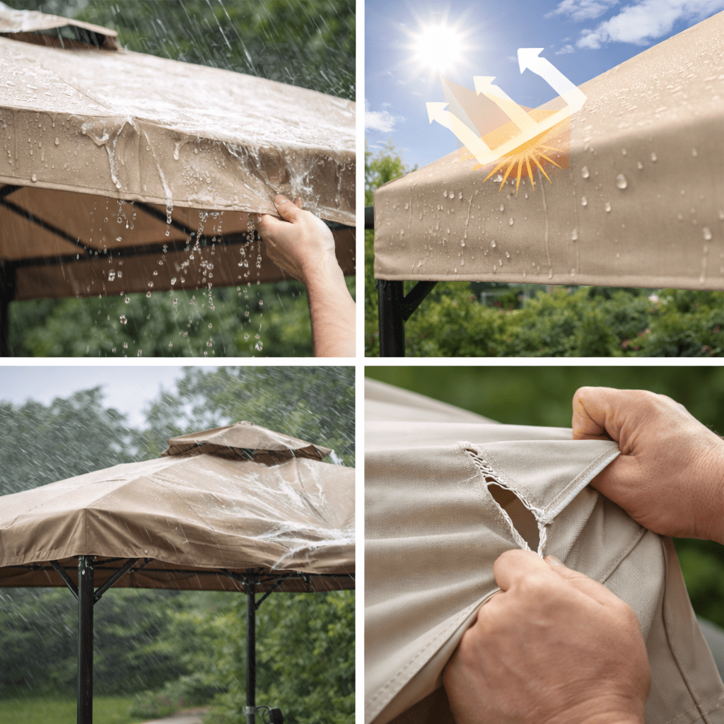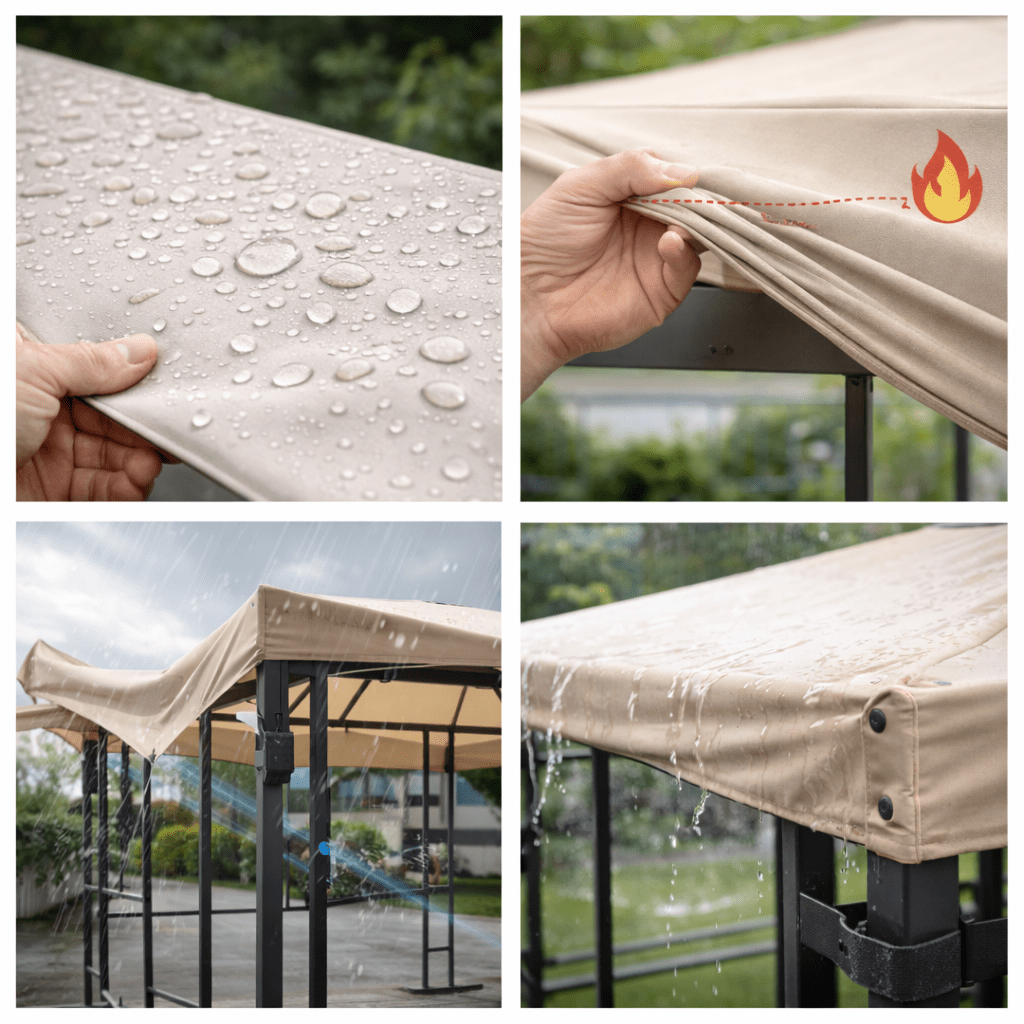 Toutes les toiles de tonnelle ne sont pas véritablement imperméables. Certaines sont simplement déperlantes, ce qui signifie qu’elles repoussent une pluie légère sans garantir une étanchéité prolongée.